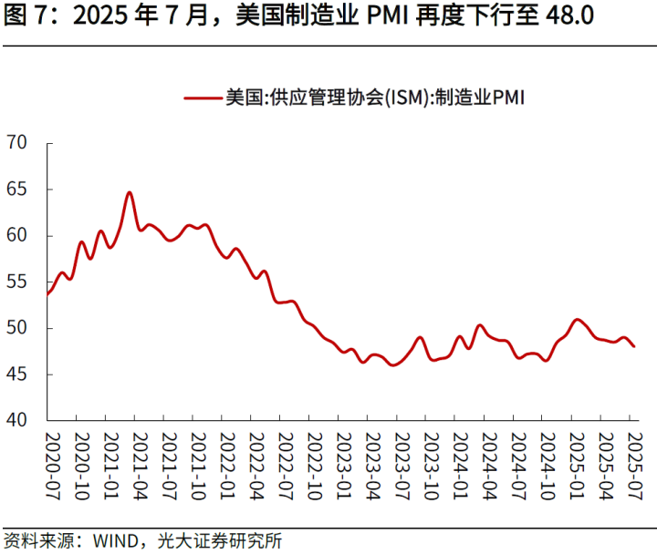 2025年7月美国新增非农就业回升,但前值被大幅下修。从新增就业规模看,7月非农就业人口增7.3万人,低于市场预期的增11.0万人,但前值由增14.7万人被大幅修正至1.4万人,显示美国就业市场承压。其中,7月服务业新增就业从前值的1.6万人升至9.6万人,显示服务业就业需求相对稳健,但商品生产部门新增就业连续三个月为负,反映企业投产意愿不足。