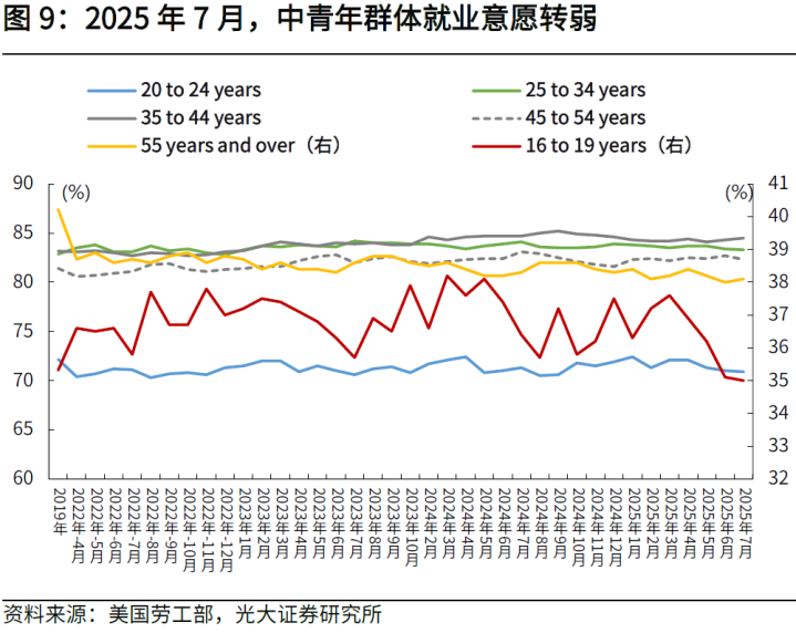 2025年7月劳动参与率回落,中青年群体就业意愿转弱。2025年7月劳动参与率为62.2%,低于前值的62.3%。从结构来看,青年群体就业意愿转弱,16岁至19岁代表的青年群体劳动参与率环比下降0.1个百分点,20岁至24岁群体劳动参与率环比下降0.1个百分点。中年群体就业意愿较弱,25岁至34岁、45岁至54岁群体劳动参与率分别环比下行0.1、0.4个百分点,仅35岁至44岁就业群体劳动参与率环比上行0.2个百分点。此外,55岁以上老年群体劳动参与率环比上行0.1个百分点。