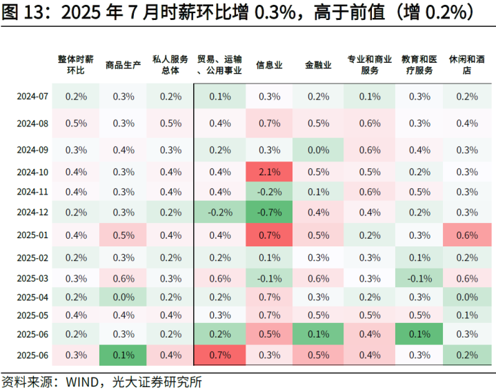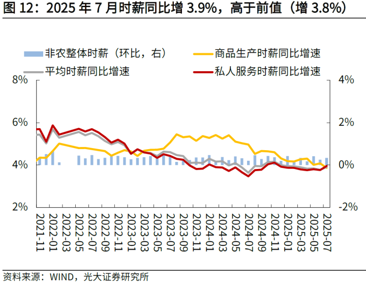 2025年7月时薪环比和同比增速均回升。环比看,2025年7月时薪环比增速为+0.3%,高于前值的+0.2%;同比看,2025年7月时薪同比增速为+3.9%,高于前值的+3.8%。