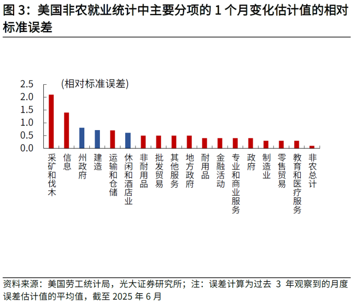 此外,从结构看,6月被下修较多的主要是政府就业(被下修6.2万人,其中州政府被下修3.7万人)、休闲和酒店业就业(被下修1.6万人)、建造业就业(被下修1.2万人),三者合计下修9万人,占6月非农数据下修值近7成。从历史预测误差看,上述行业就业估计值的相对标准误差也较高,容易出现较大波动。