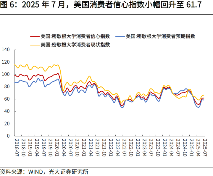 在消费方面,关税落地后,4月和5月的美国零售数据环比增速连续为负,此后6月及7月密歇根消费者预期和信心指数连续回升,6月美国零售数据环比增速回升,指向关税政策对于消费预期的第一轮直接冲击基本已经落地。但后续关税推升通胀、拖累经济后,预计会有对消费带来第二次冲击(详见2025年7月18日外发报告《高瑞东周欣平:美国消费增速高于预期,但不宜过度高估韧性》)。