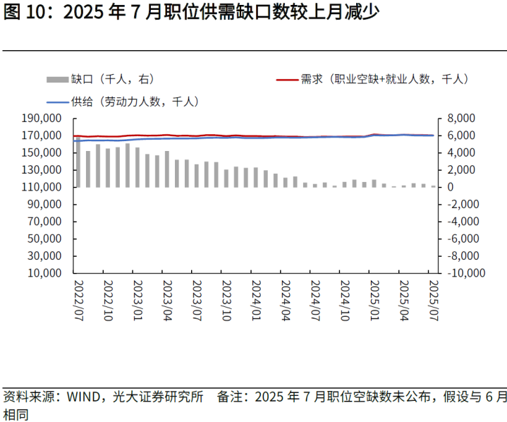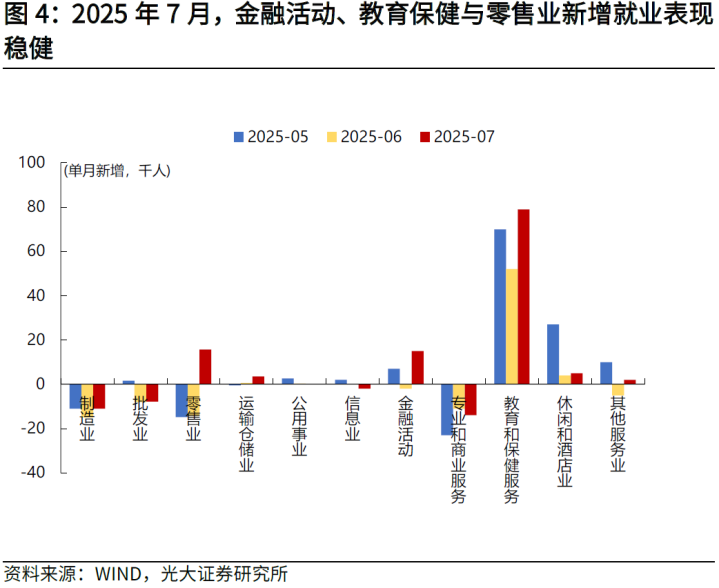 一方面,金融活动、教育保健与零售业就业表现较好,反映服务业就业需求相对稳健。7月金融活动、教育保健与零售业分别新增就业+1.5万人、+7.9万人、+1.6万人,高于前值的-0.2万人、+5.2万人和-1.4万人,服务业需求相对稳定。