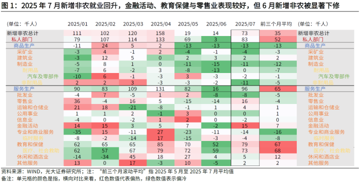 二、新增非农就业低于预期,金融活动、教育保健与零售业表现稳健