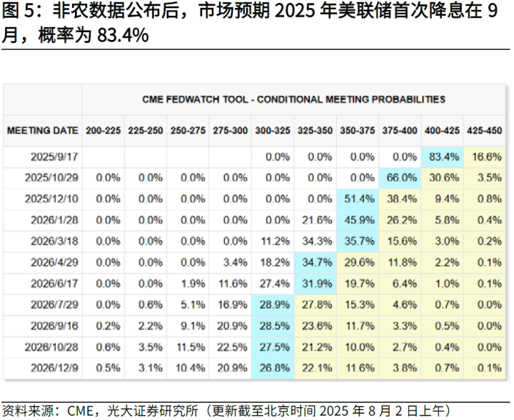 客观上看,5月和6月非农数据被累计下修25.8万人,7月新增7.3万人的就业人数相较于一季度高于10万人的月均新增就业水平明显回落,同时失业率也环比上行至4.2%,均指向美国非农就业弱势渐显,美联储在下半年重启降息操作的概率较大。CMEFedwatch工具显示,市场预期2025年全年美联储将降息3次,首次降息时点为9月,概率超8成,10月、12月将连续降息,概率分别为66.0%、51.4%。